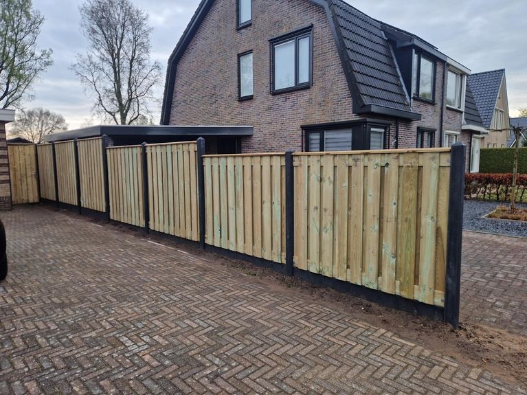 Hout-beton schuttingen zijn duurzaam, stevig en onderhoudsarm. Het betonnen onderstuk voorkomt houtrot en zorgt dat de schutting jarenlang mooi blijft staan – ook bij nat weer of zachte grond.