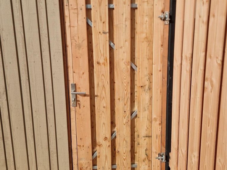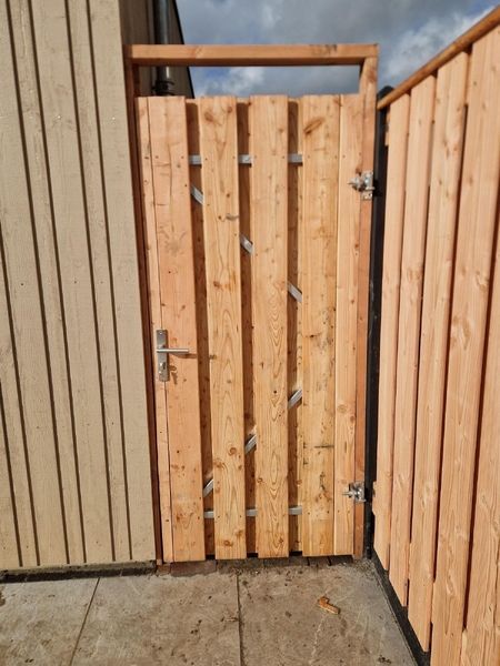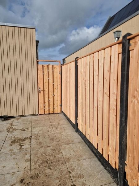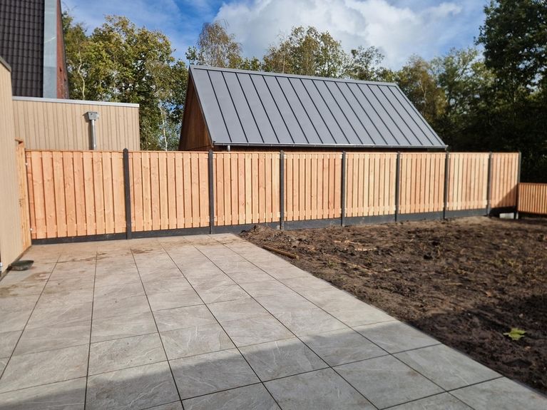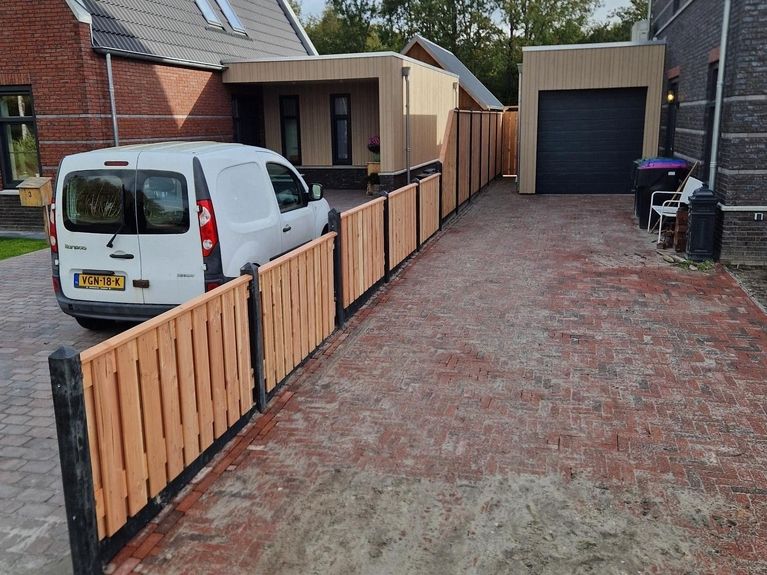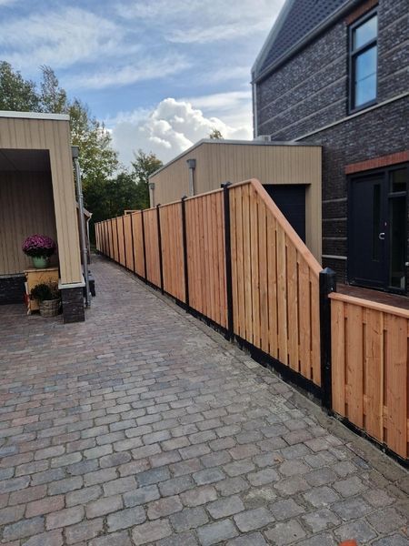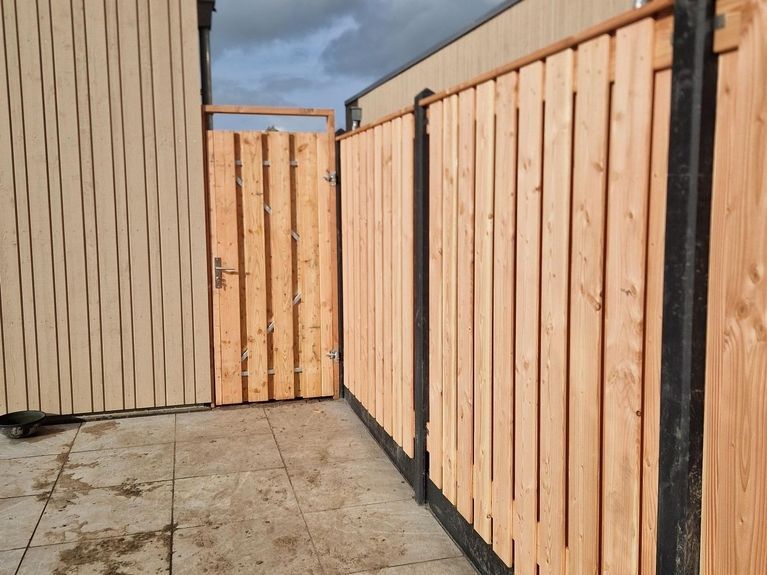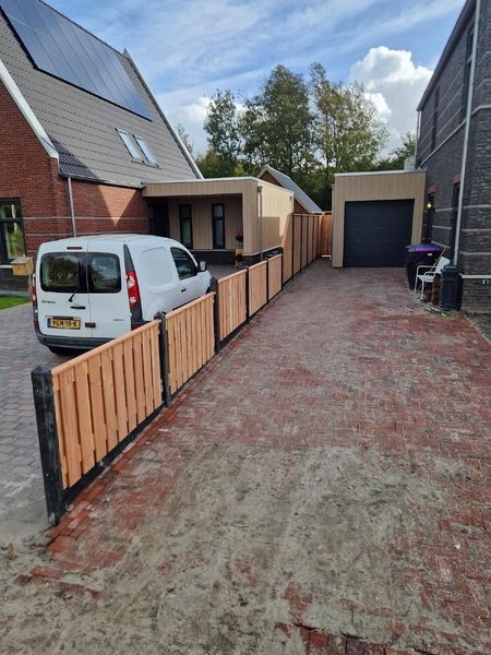 De gecoate betonpalen en onderplaten zorgen niet alleen voor stevigheid, maar ook voor een nette afwerking die beter bestand is tegen weer en vuil. Het douglas hout – gebruikt voor de schermen, afdeklatten, deur én het lage hekwerk – brengt warmte en een natuurlijke balans in het geheel. Zo kreeg de tuin een robuuste, duurzame erfafscheiding die direct in het oog springt.