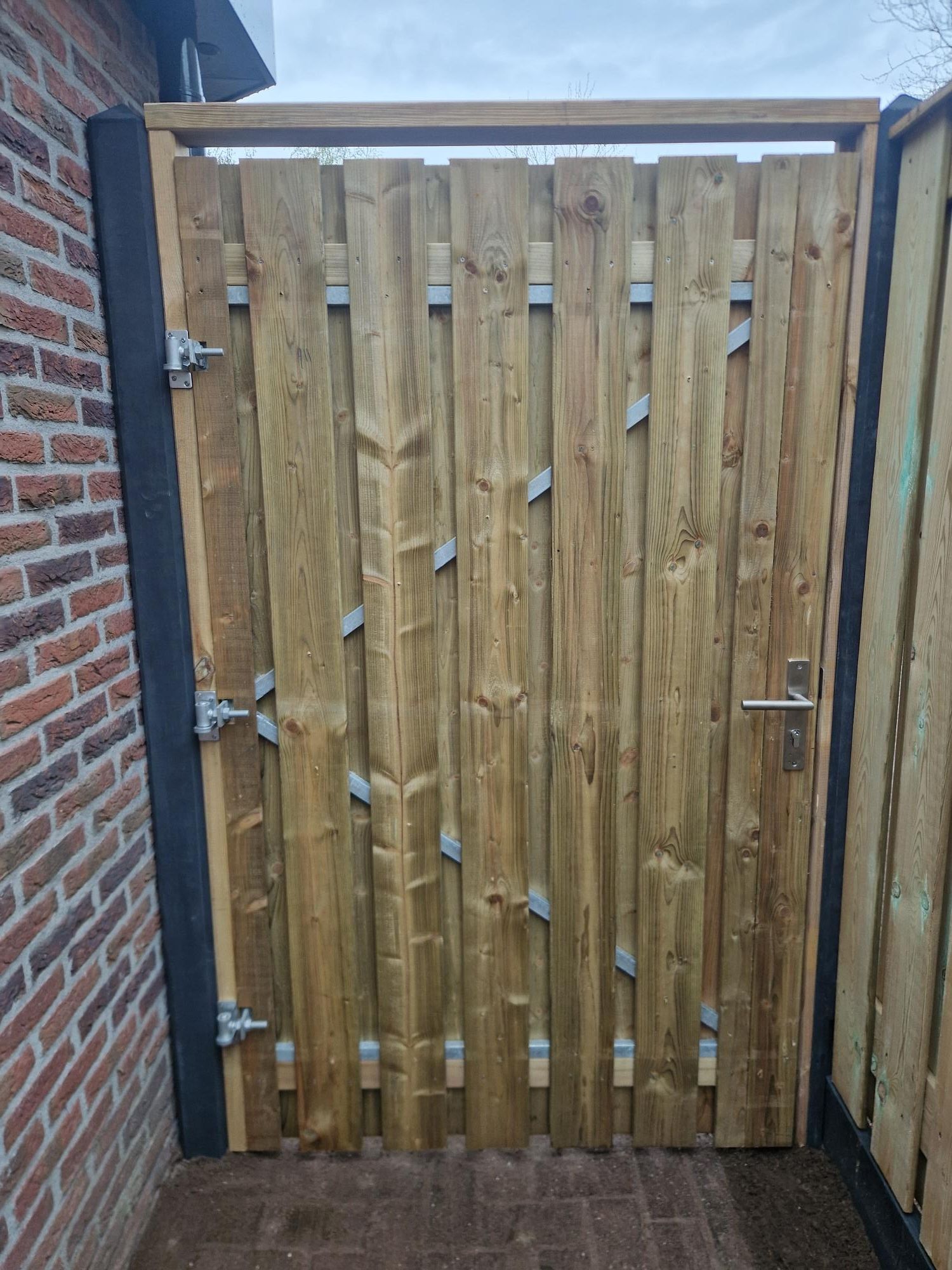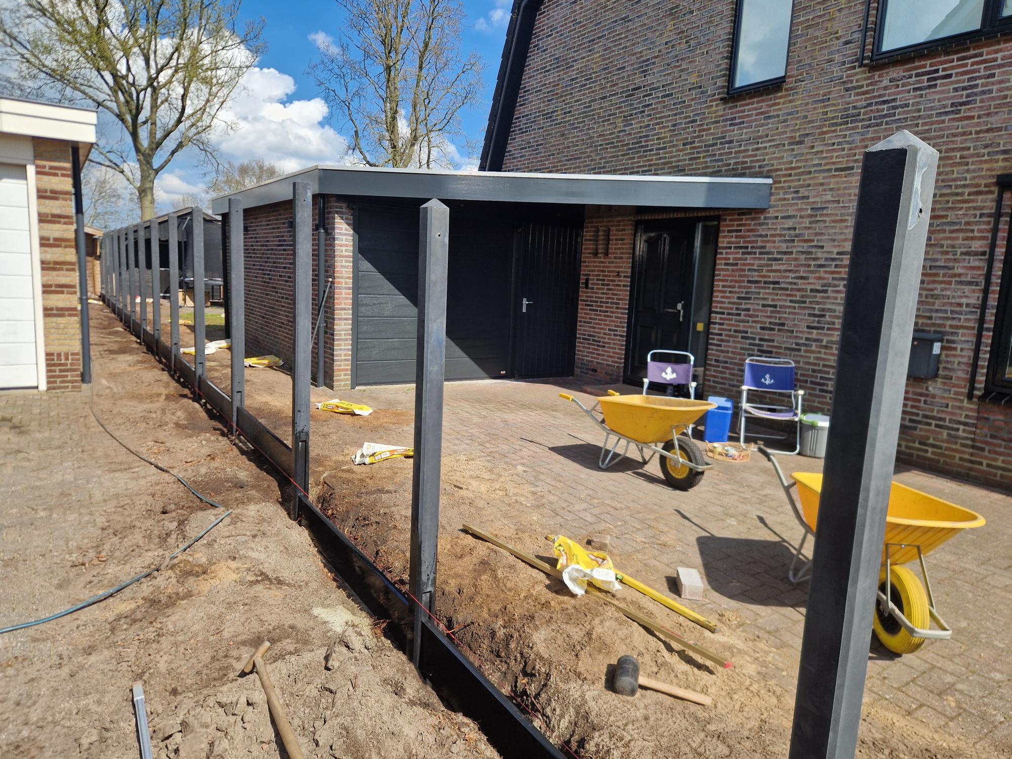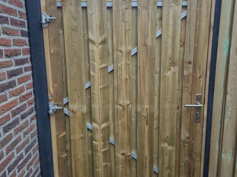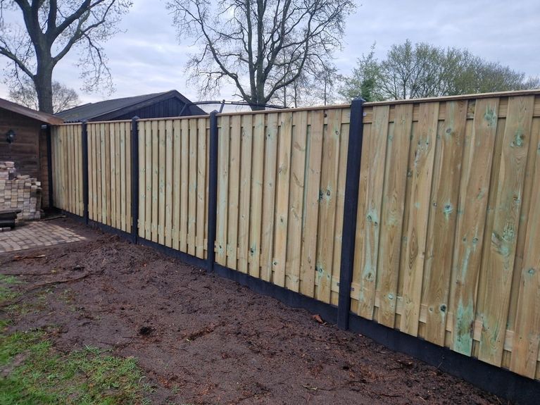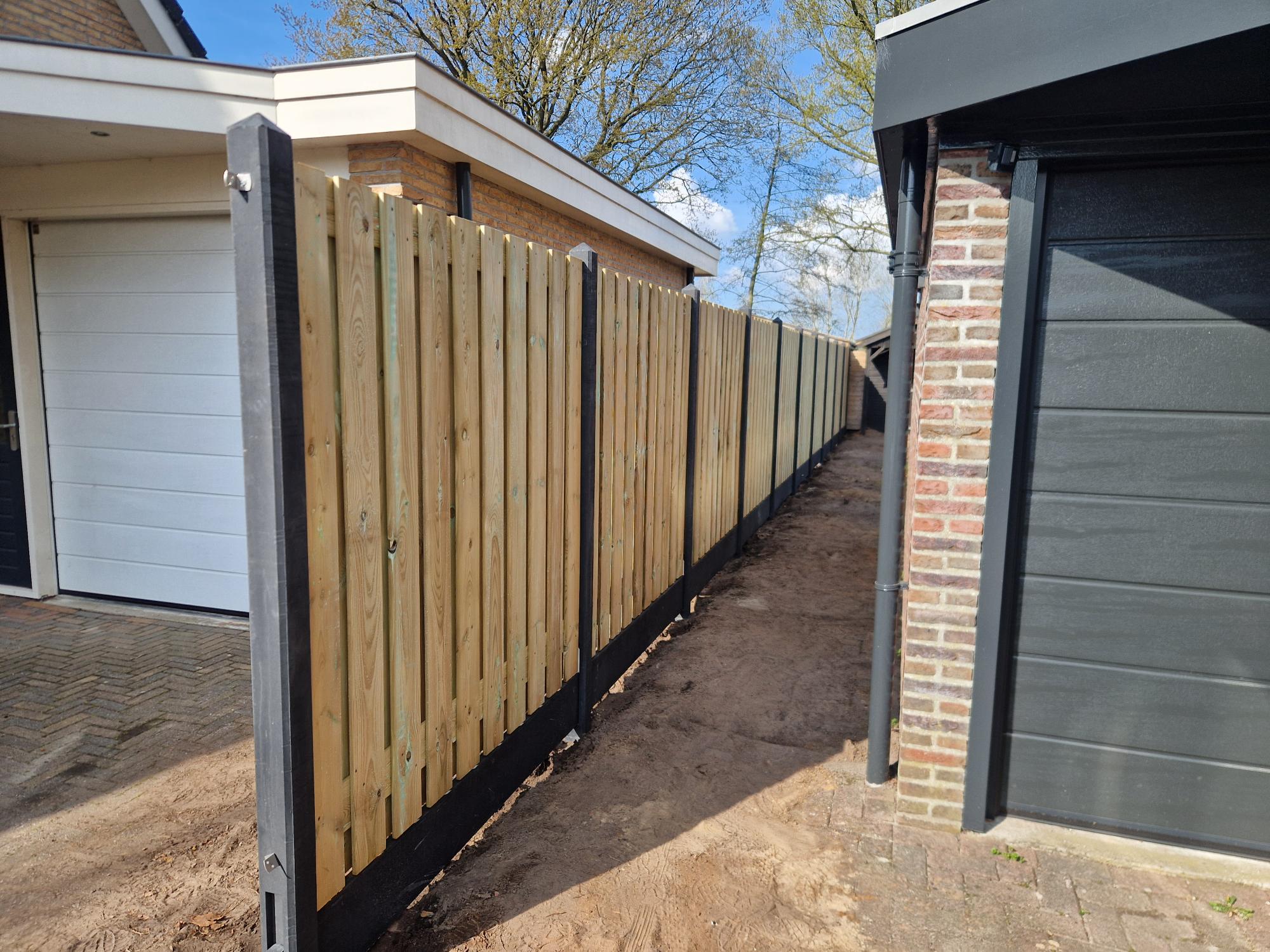 De schutting bestaat uit duurzame betonpalen en onderplaten met stevige houten schermen ertussen. Aan beide kanten is een deur geplaatst voor een praktische achterom. Door de combinatie van beton en hout staat de erfafscheiding stevig, blijft hij jarenlang mooi én sluit hij perfect aan bij de stijl van de woningen. Een project waar afwerking en functionaliteit samenkomen.