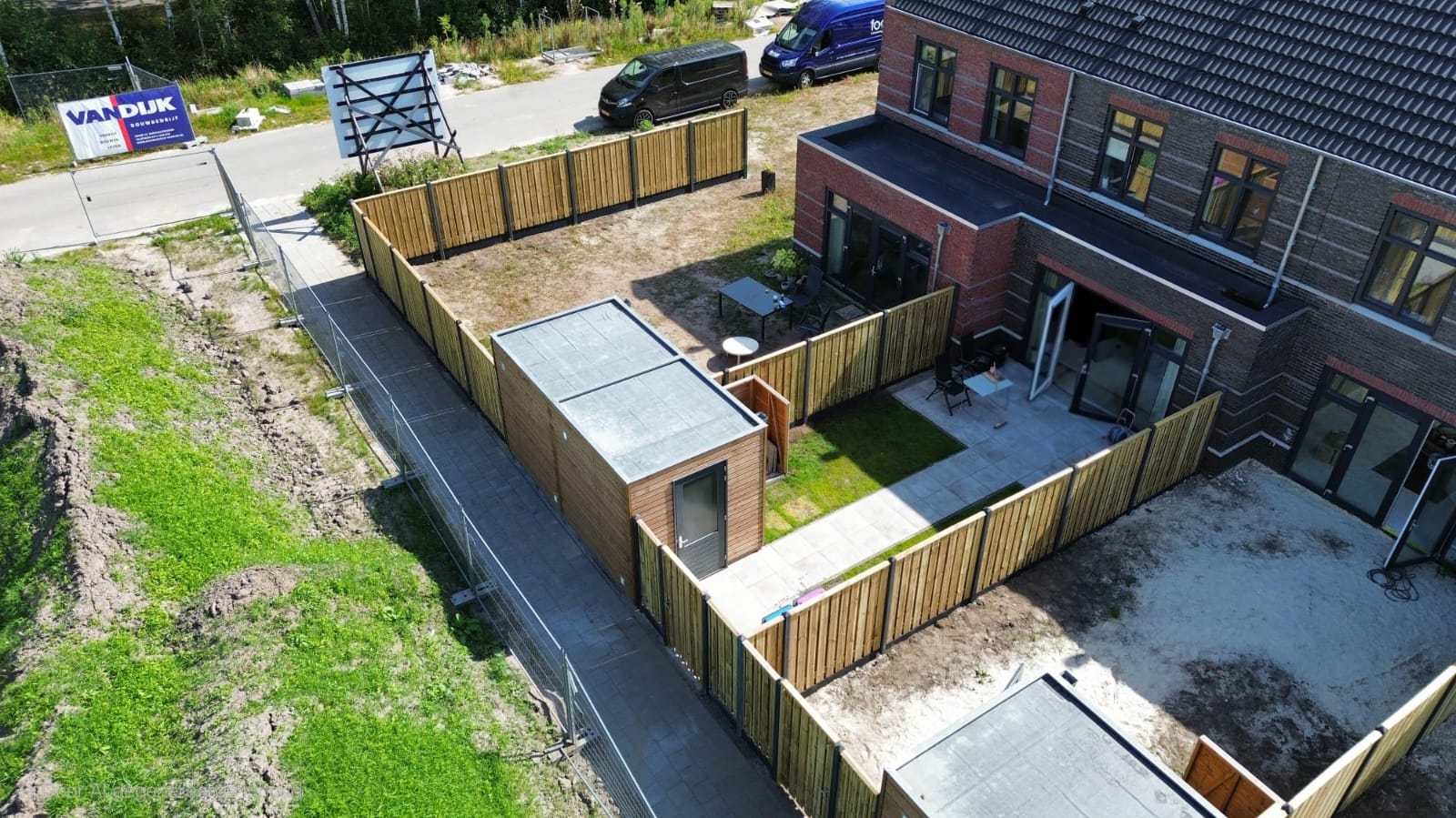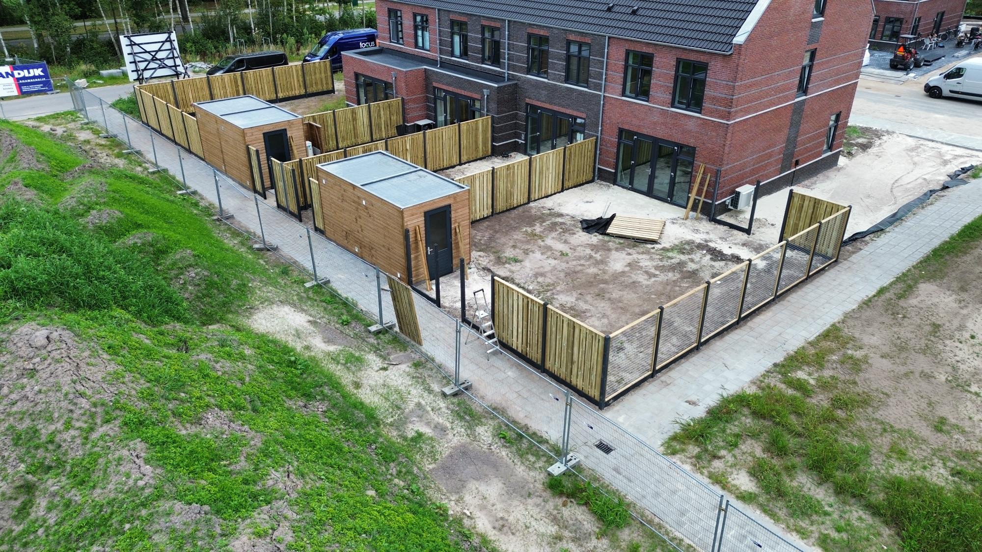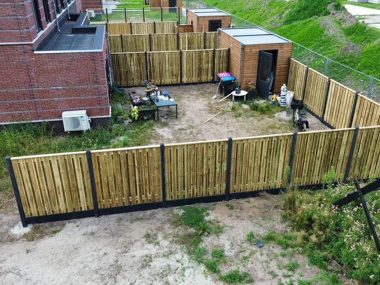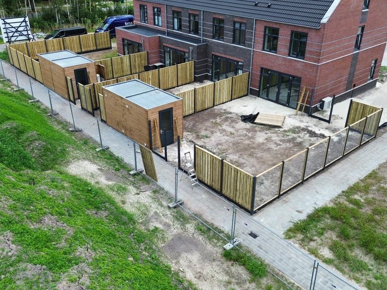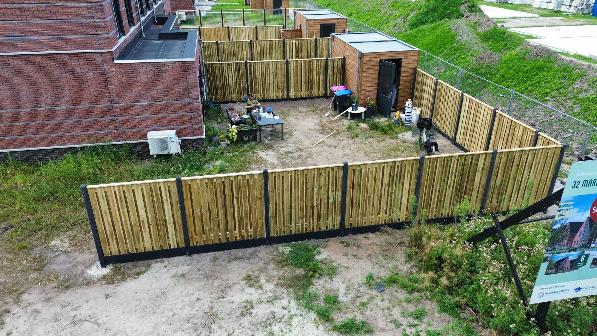 De schuttingen zijn strak in lijn geplaatst, waardoor de tuinen één rustig geheel vormen. Door de combinatie van robuuste betonpalen, stevige onderplaten en houten schermen is het resultaat niet alleen mooi om te zien, maar ook bestand tegen weer en wind. Een duurzaam project dat laat zien hoe functionaliteit en uitstraling hand in hand gaan.